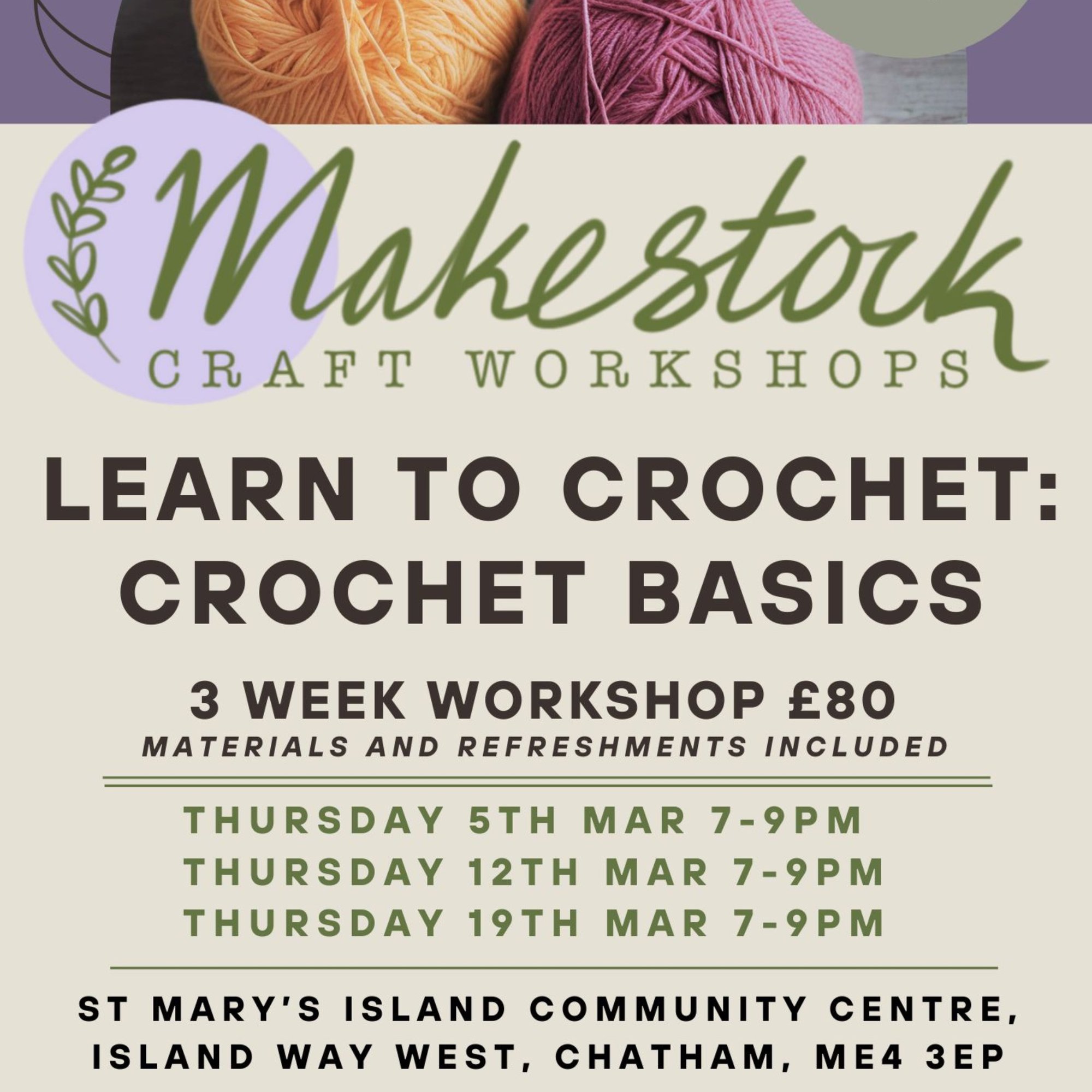 All materials and tools included as well as refreshments. This course will be taught using UK crochet terminology. Right and left handed welcome!